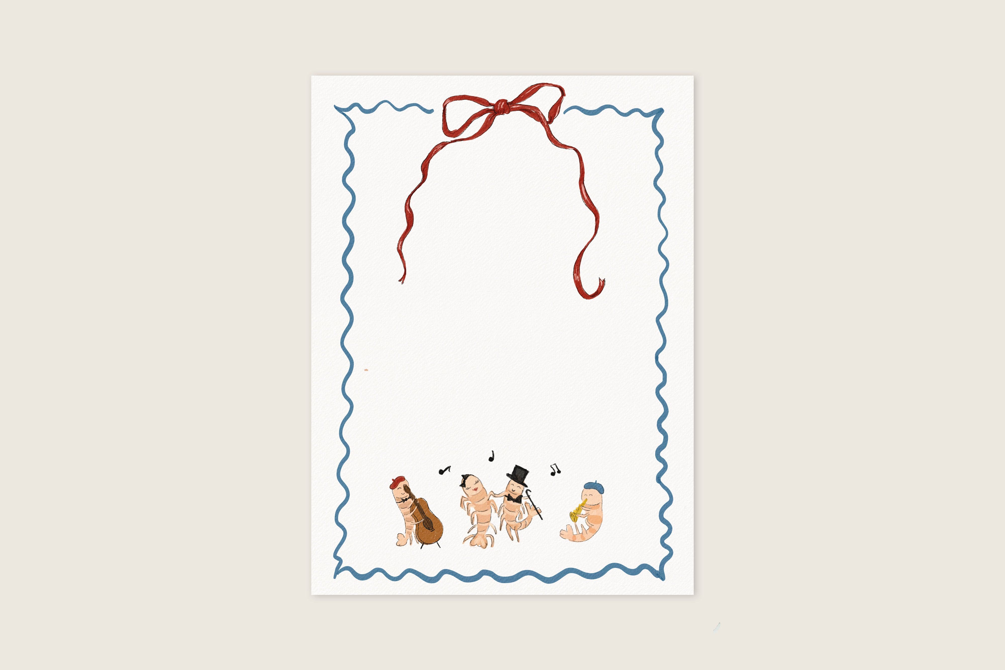 These menu cards are painted with cozy shrimp making music. Finished with a cute bow and a beautiful blue wavy border.